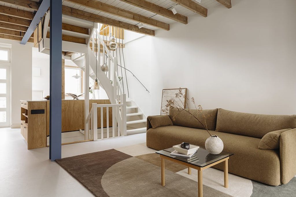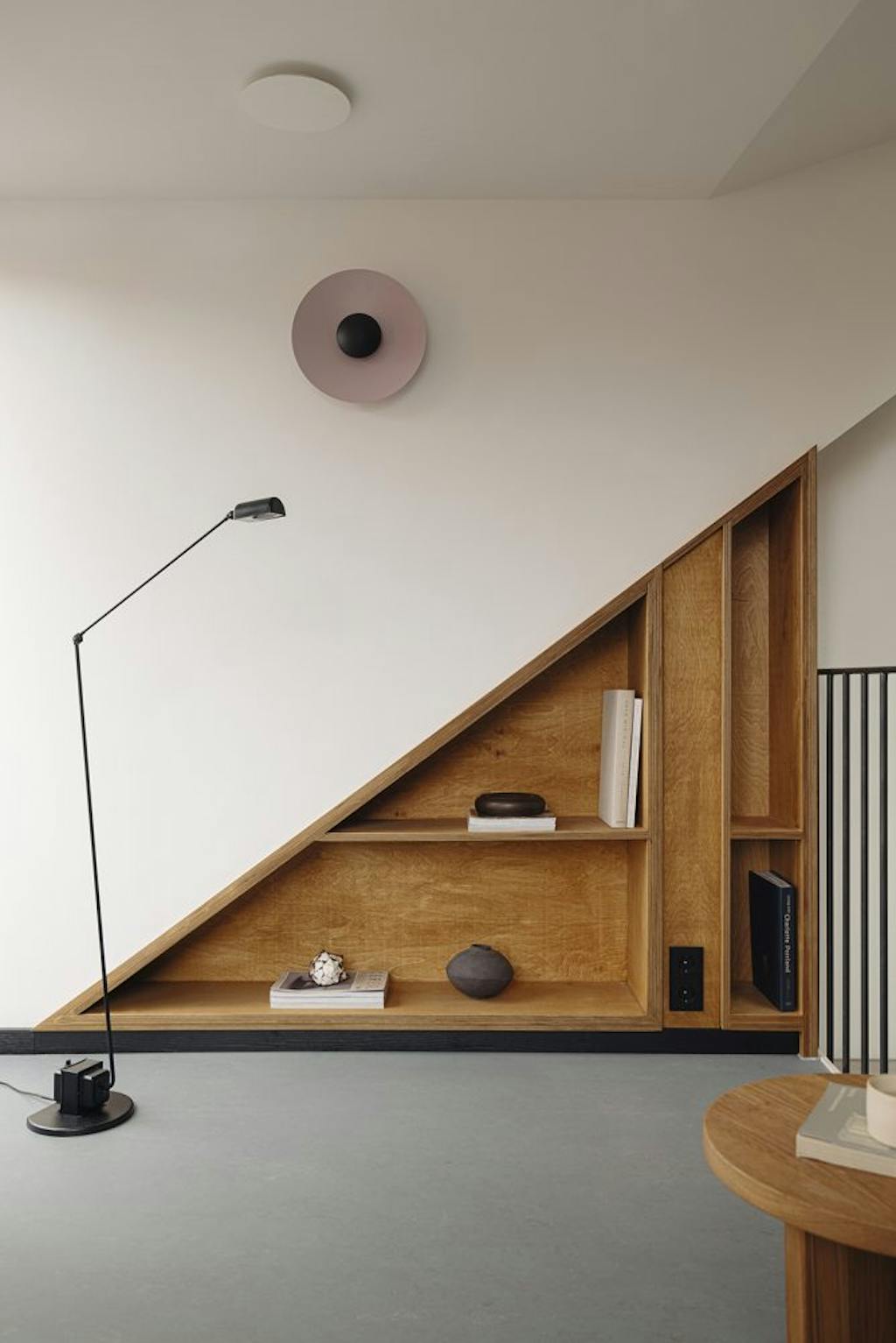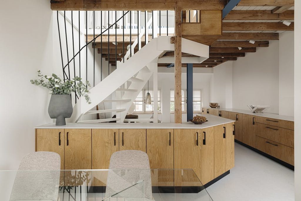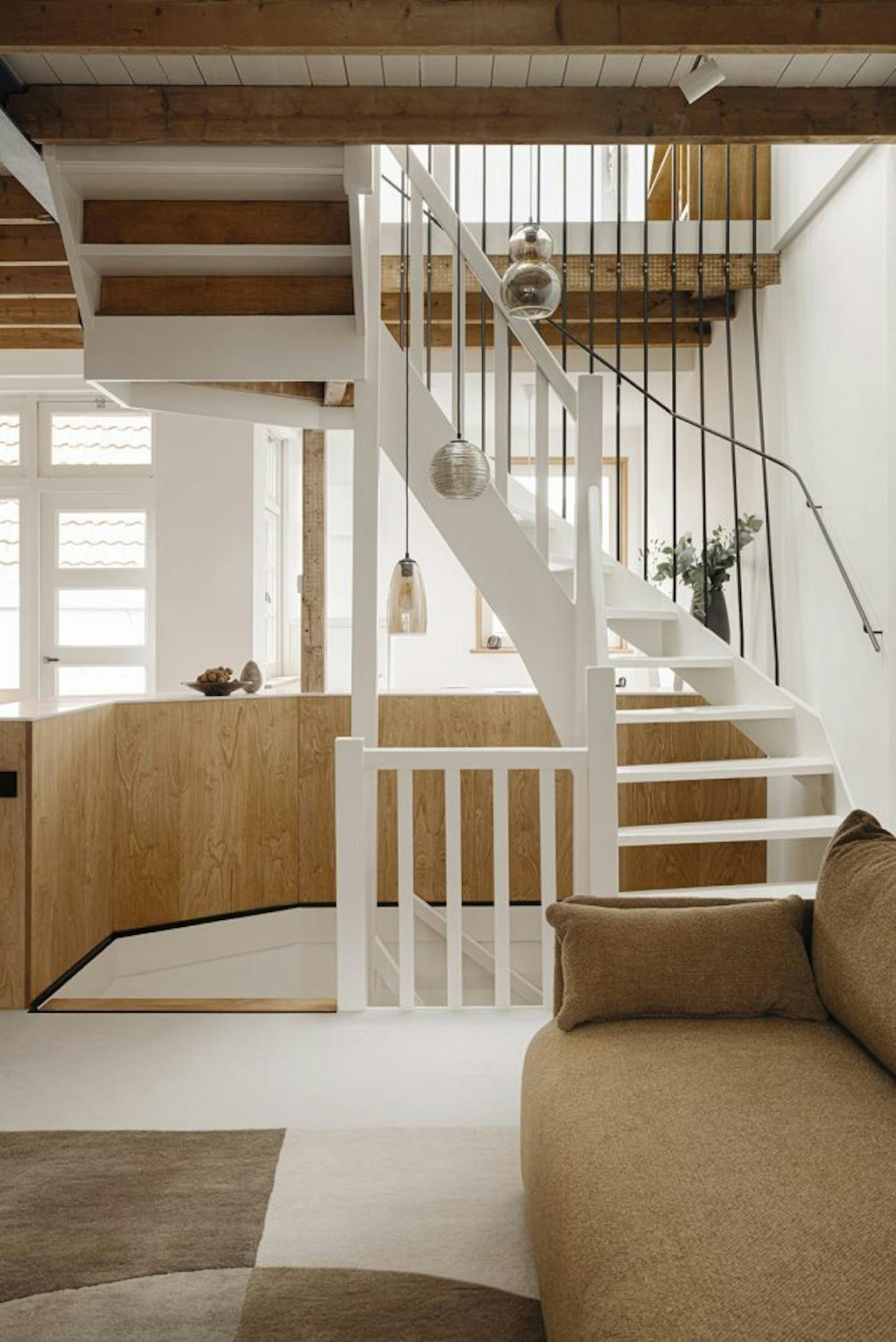 Door — 19. maart 2026Wie door het centrum van Amsterdam loopt, verwacht niet direct rust en ruimte te vinden. Toch is dat precies wat er schuilgaat achter de gevel van dit monumentale pand uit 1938. Het appartement, ontworpen door Studio SAAM voor opdrachtgever Carolyn, is een stille oase te midden van de stad. ‘Je voelt je geborgen, en tegelijkertijd ervaar je overal het uitzicht op de stad,’ vertelt architect Joris Heitkamp. Vanuit de werkplek boven kijk je uit over de daken van Amsterdam, met de Sint-Nicolaaskerk aan de horizon.