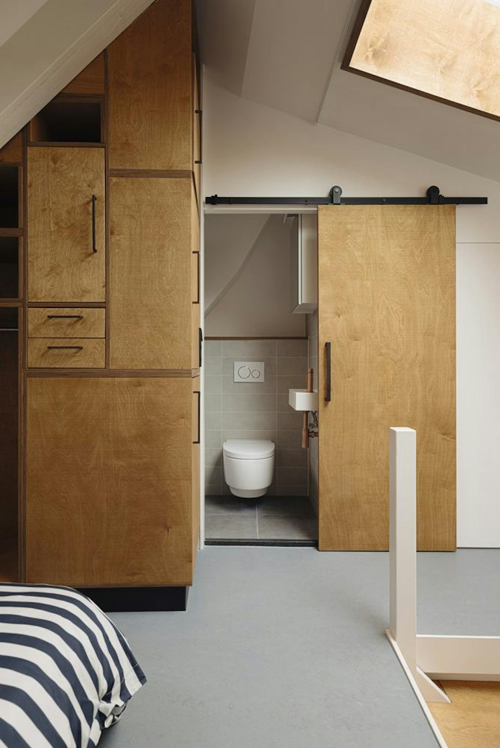 Een belangrijk onderdeel van de renovatie was het verduurzamen van het monument – een uitdaging op zich. Zo werd de woning volledig van het gas gehaald en dampopen geïsoleerd met houtvezel. De vloeren bestaan uit natuurlijke materialen als vilt en linoleum, en ook stuc, verf, gordijnen en kasten zijn gemaakt van ademende, biobased producten. Een warmtepomp zorgt voor ventilatie met warmteterugwinning, waardoor het binnenklimaat behaaglijk en gezond blijft. ‘Het mooie van dit project is dat de opdrachtgever gaandeweg echt is gaan geloven in het ontwerp,’ vertelt Joris. ‘Ze begon met een beperkte vraag, maar gaf ons uiteindelijk het vertrouwen om het plan helemaal door te voeren. Daardoor hebben we tot in detail kunnen ontwerpen en bouwen.’