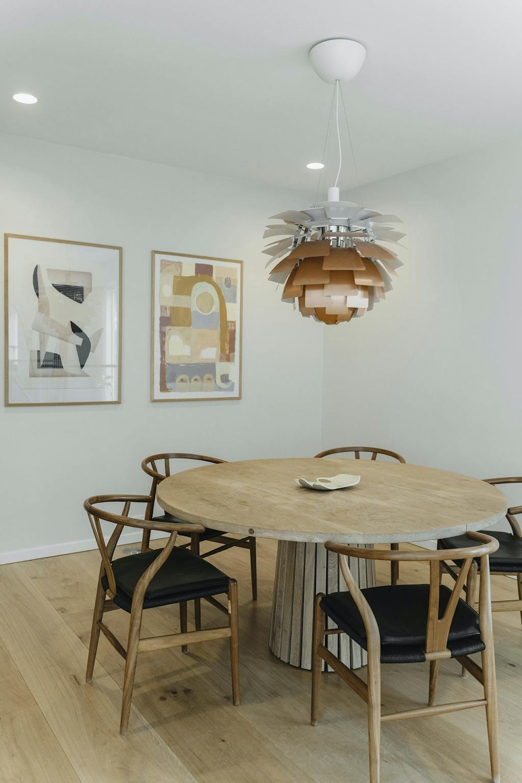 Oude en nieuwe designklassiekers. Wegners klassieke Y-stoelen zijn gecombineerd met een koperen PH Artichoke van Louis Poulsen. De moderne eettafel van massief eiken van Træfolk past er mooi bij. Aan de wand hangen een origineel werk en een poster van Can Family.