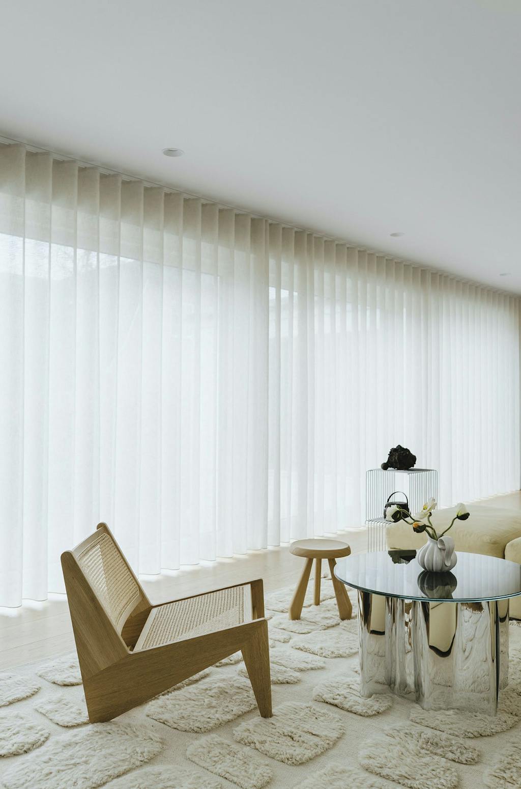 De fraaie panoramaramen aan de tuinzijde zijn het eerste wat je ziet als je de woonkamer binnenkomt. De gordijnen zijn van &Drape.
