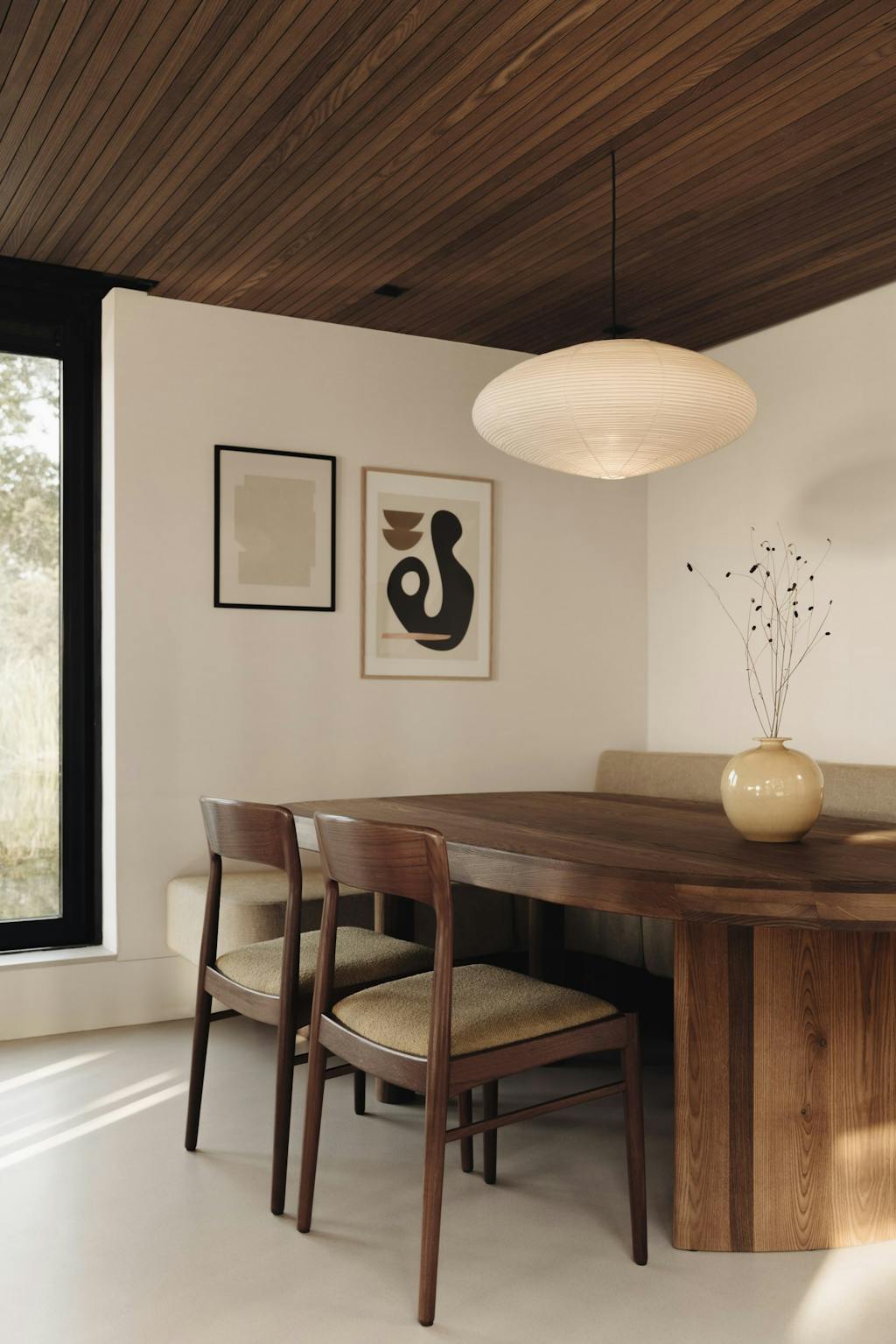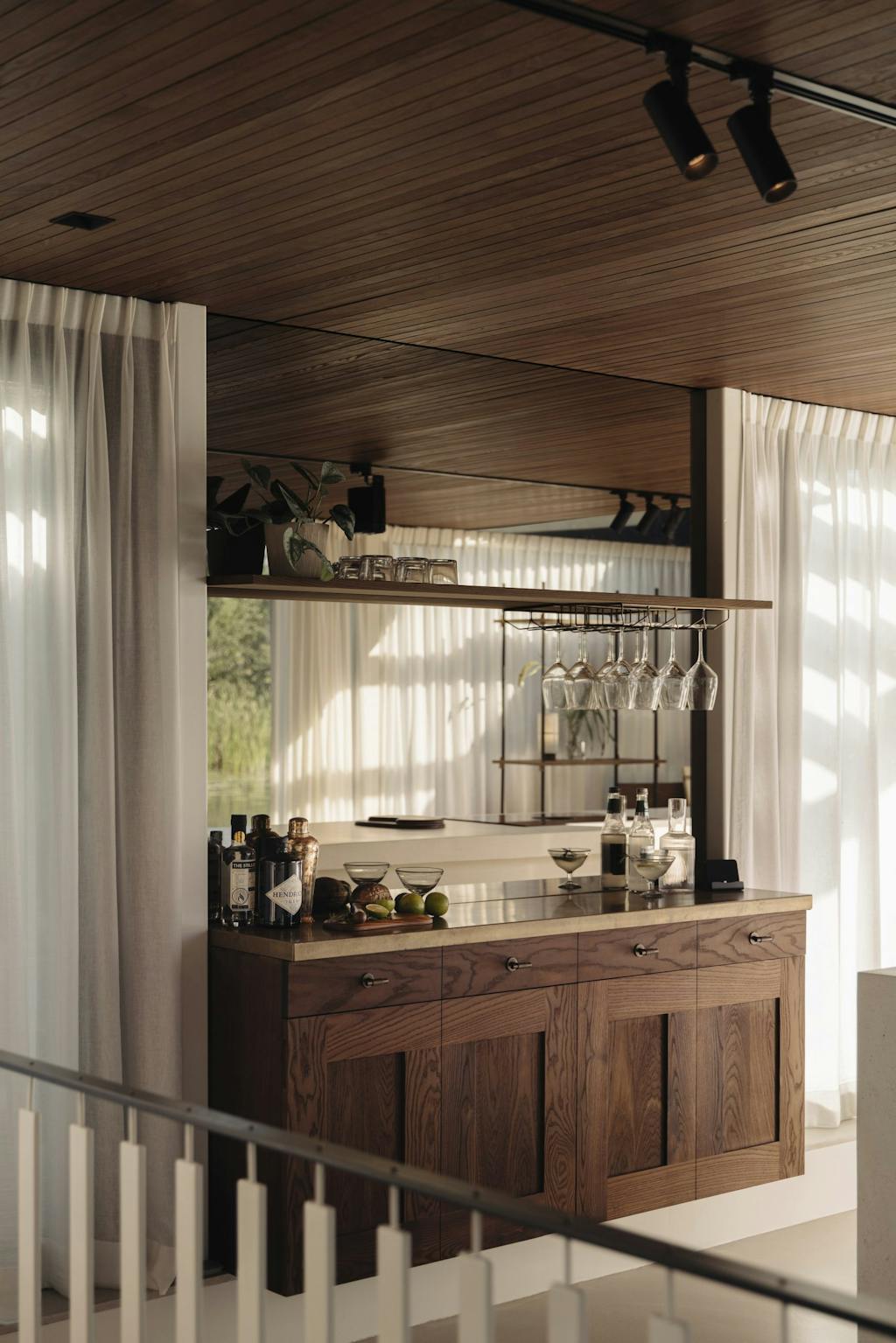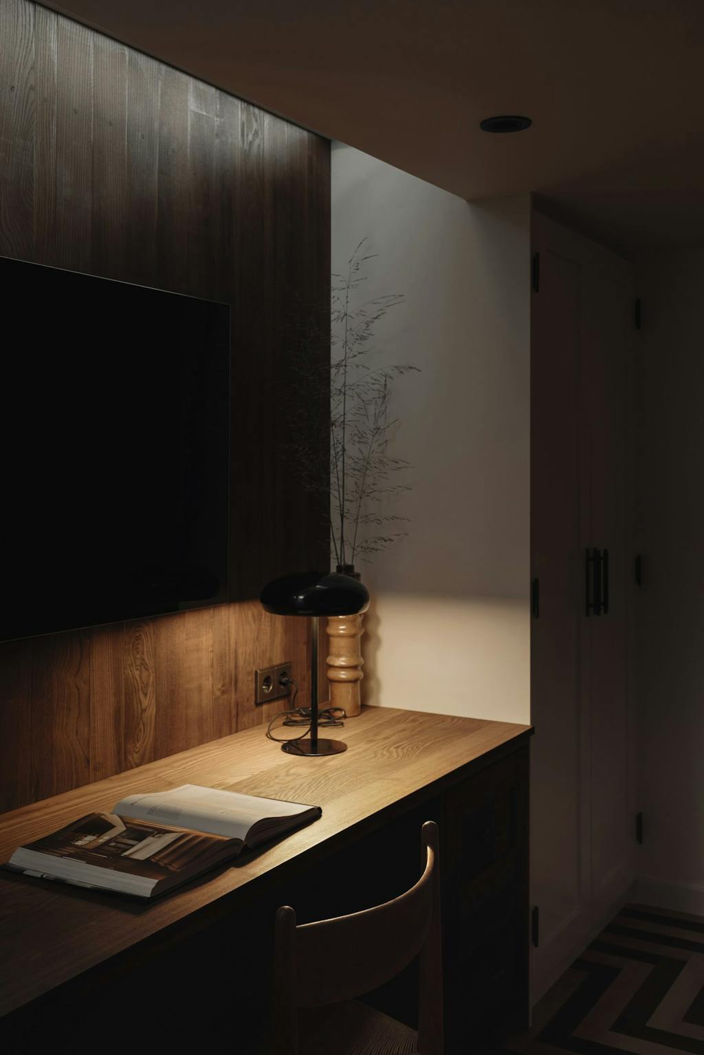 Studio Asker zocht naar een balans tussen vintage en nieuwe meubelstukken, met als resultaat een persoonlijk, charmant interieur met een beetje grandeur. De loungestoel van Jindˇrich Halabala is gekocht via Aya Aya en opnieuw gestoffeerd. De vloerlamp is de Dórica van Santa & Cole en de Romare-gordijnen zijn van Premier Voile.