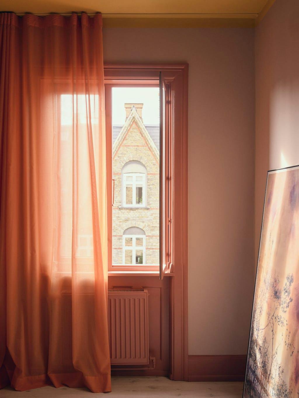 Gele, groene en roze plafonds, muren in nog meer verschillende kleuren en bijpassende gordijnen. Geen enkel oppervlak is wit in het 138 vierkante meter grote huis van Sisse en Esben, waarvan ze in 2022 de sleutels kregen.