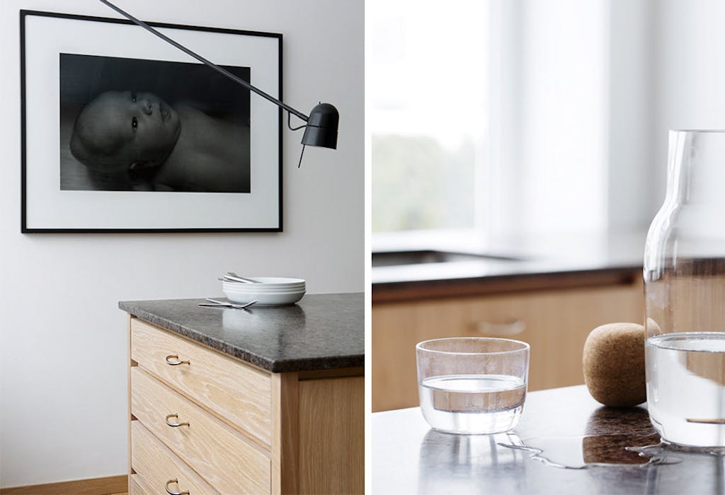 PREHISTORISCH. Het werkblad van Lundhs Antique is gemaakt van ruim een miljard (!) jaar oude Noorse steen, uit Sirevåg in de regio Vestlandet. Het vulkanische gesteente is slijtvast en hittebestendig en kan tegen zuren als wijn en citroensap. De lamp is de Counterbalance van Daniel Rybakken voor Luceplan, de foto aan de wand is van Tom Sandberg. Het glas en de karaf komen uit de serie Corky van Andreas Engesvik, Oslo voor Muuto.