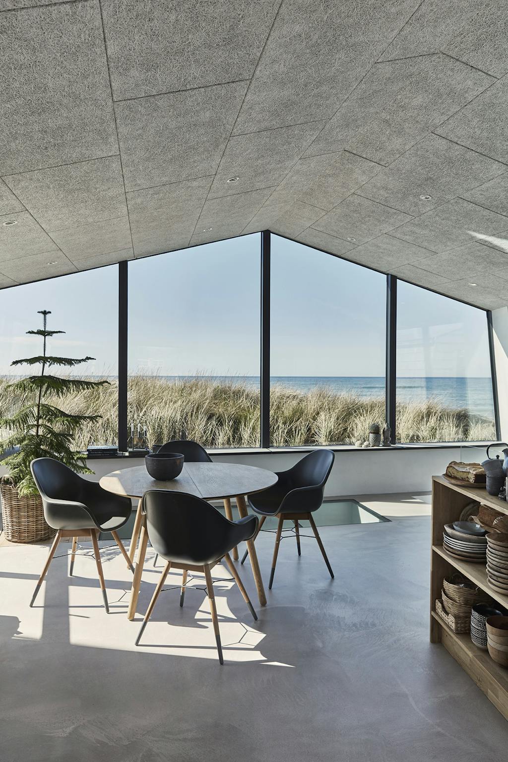Juist op deze plek hebben Gitte en Lasse een huis gebouwd, dat met zijn zilvergrijze houten gevel haast versmelt met de natuur. Vanaf de weg lijkt het niet veel, maar binnen heb je overal een fantastisch uitzicht op de golvende horizon van de Noordzee.