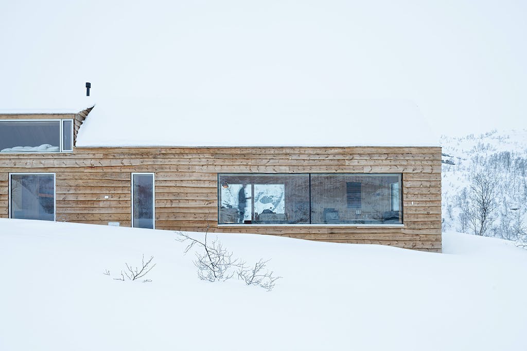 Een scherpe punt die uit de sneeuw piept. De spitse, geometrische vorm steekt duidelijk af tegen de ronde heuvels en bergen in de Noorse regio Sirdal. Van voren lijkt het meer op een eenvoudige hut of misschien zelfs een klein jachthuis. Als je je echter waagt aan de lange kant van de blokhut, besef je dat het veel meer is dan dat. Hoewel het huis maar drieënhalve meter breed is, steekt de opvallende woning maar liefst 20 meter naar achteren uit.