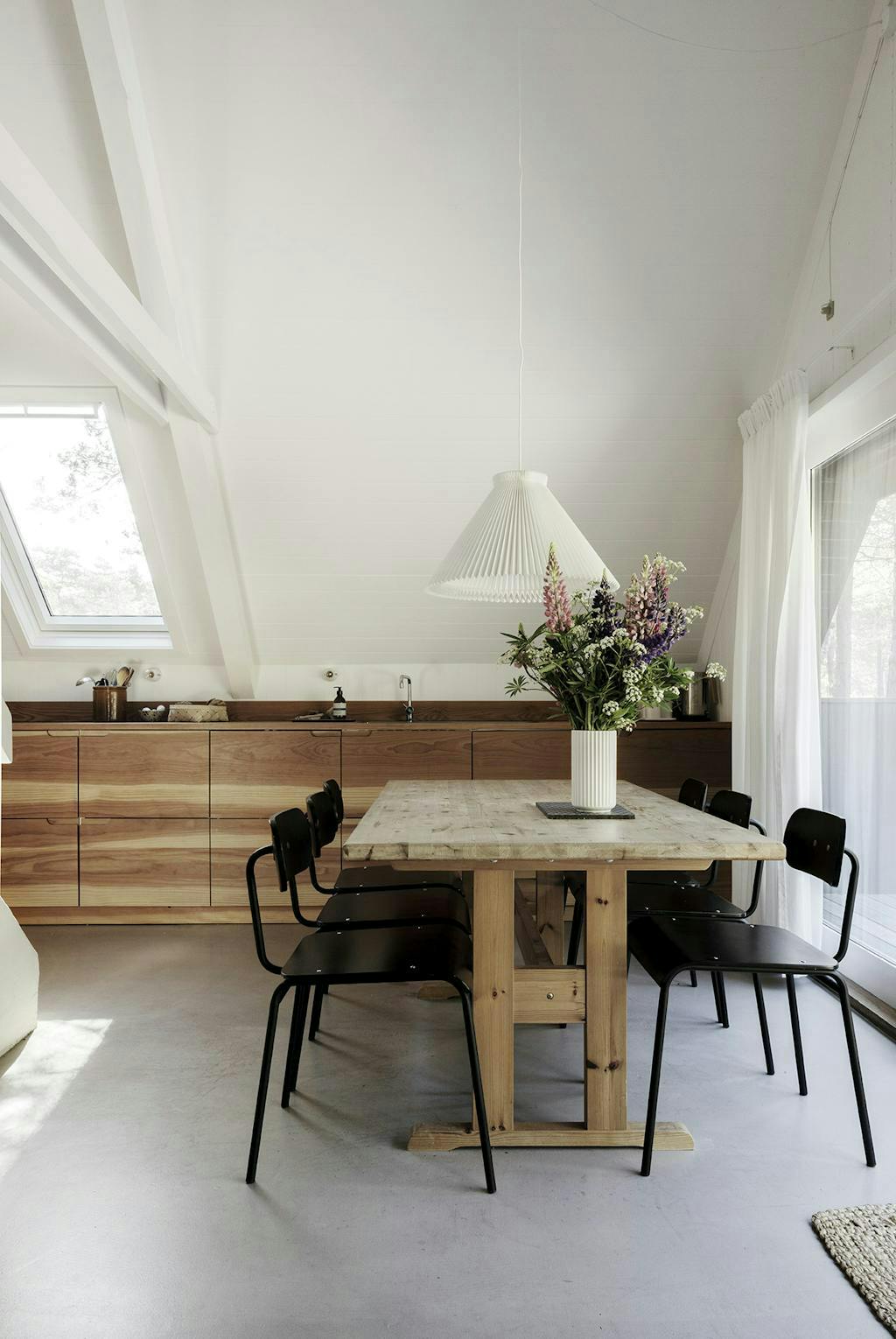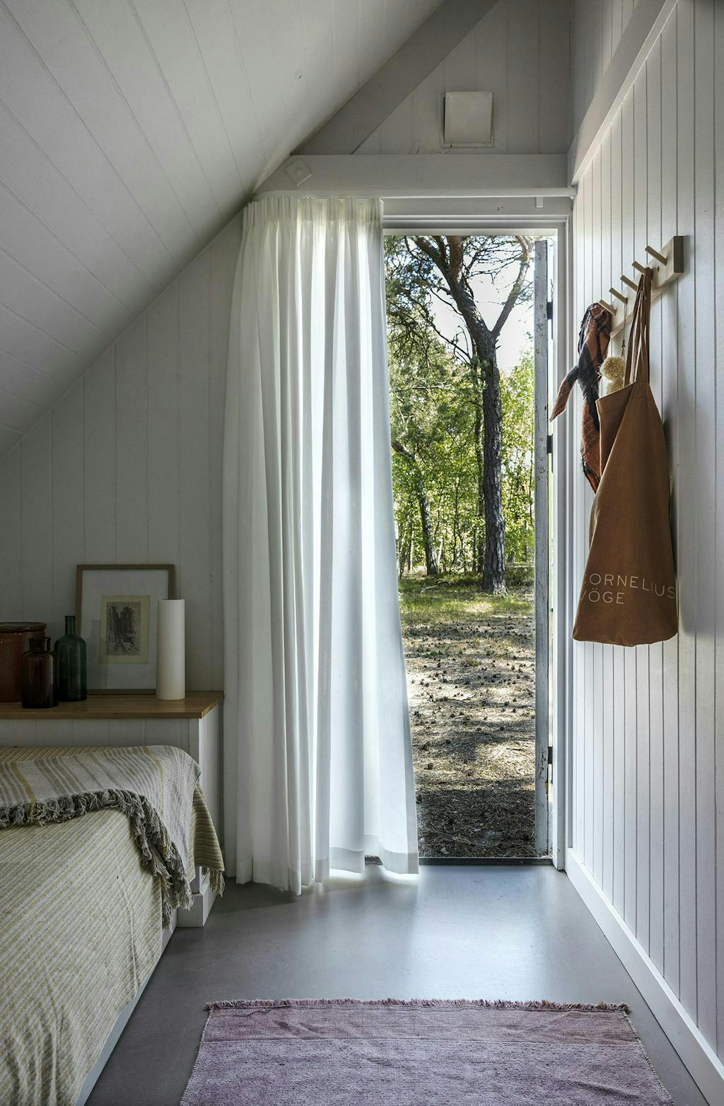 Nanna Vöge en Dan Cornelius hebben alle veranderingen in het vakantiehuis zelf ontworpen, waaronder een nieuw terras en een nieuwe keuken en leefruimte. Als de grote schuifdeur helemaal open is, ervaar je binnen en buiten als één grote ruimte. Vanaf het terras zie je de haard en de trap naar de eerste verdieping, waar vier slaapkamers zijn. Toen de bewoners in het huis trokken, lag er zeil op de vloer. Dat is vervangen door een gietvloer, die met wax is afgewerkt.
