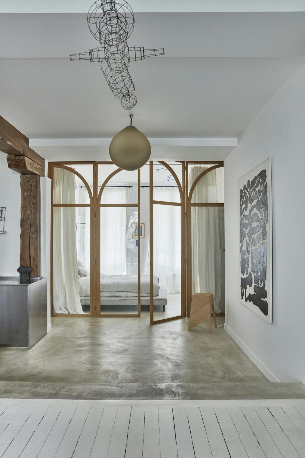 Op de vloeren staan houten meubels, en stoffen zorgen voor vulling en geven de kunstwerken warmte. De deuren zijn bekleed met rotan.
